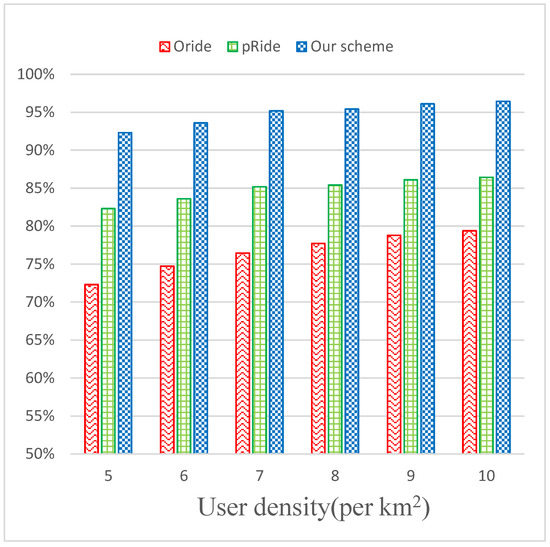 As shown in Figure 6, the matching accuracy gradually rises as the user density increases, since there are more users around each other. The accuracy of our scheme is always higher than 90%, which is much higher than other schemes, as we consider the complexity and time variations of the road network due to the the road network distance.