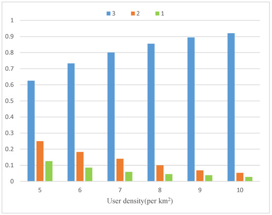 The matching distribution under different user density is shown in Figure 7, which depicts the transport capacity. With the increase in user density, there are more users in the matched group. The proportion of groups containing three users increases and the proportion of un-grouped users decreases. When there are fewer users, the destinations of users are sparse and scattered. The matching is not easily completed. When the user density increases, there are more users in the partition zone, which makes matching easier. The proportion of groups containing three users is about 80 percent when the user density reaches 7 users per km, which means the matching scheme is effective.