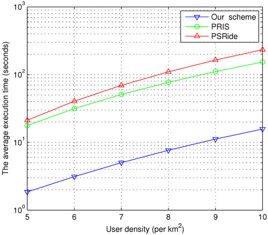 Figure 8 depicts the execution time of PRIS, PSRide and our scheme under different user densities. With the increase in user density, the server has to execute more computation due to the greater number of potential match users. Our scheme is much more efficient, since PRIS and PSRide do not consider the scenario of massive numbers of users. For each match, our scheme takes less than 10 seconds in most cases, while the other schemes require tens of seconds to find partners.