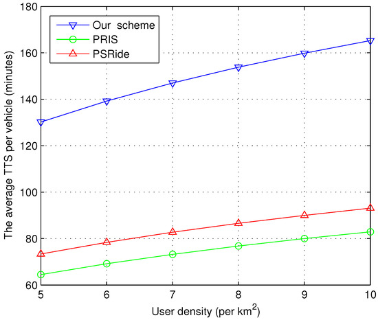 The average TTS per vehicle is shown in Figure 9, which means the the fuel consumption reduction brought by the ride sharing. We can see the average TTS of all the schemes increases with user density. With the increase in user density, their are more potential user matches. Some ungrouped users find matching partners. The matching result is more accurate. Our scheme is much more efficient, since PRIS and PSRide do not consider the scenario of massive numbers of users matching.