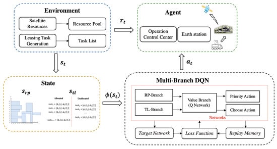 A multi-branch DQN based resource allocation approach for satellite communications can be defined as follows. Given the satellite communication system conditions, the satellite resource and task demand generation of the satellite communication system is defined as the environment of reinforcement learning. In this environment, there is a state , including the resource pool state  and task list state , as well as a series of valid action sets  for decision-making. The agent controlled by MBDQN will select an effective action  in the action set , and execute the action  in the environment to obtain reward  at time t, after which the state of the environment is transferred to . In this method, an iteration will be executed until the environment reaches the termination condition, that is, when all allocations are completed and the resource pool has no further resources to allocate.