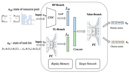 RP-Branch is a convolutional neural network (CNN) composed of convolutional modules, each consisting of convolutional layers, batch normalization (BN) layers [], and ReLU activation. The resource pool state matrix  calculated from Equation (2) has an input size of N * N that resembles a 2D image. Therefore, CNNs are more conducive to extracting discriminative features  of the satellite resource pool state. The role of RP-Branch is to extract features from the input  and leverage them as the prerequisite for deriving the action-value function. TL-Branch is a fully connected (FC) neural network. The satellite task list input sequence  with an input size of 3 * M is calculated by Equation (1). Input data  are serialized for FC layers to extract features from them. The objective of TL-Branch is to extract the features from the input , which are used to estimate the action-value function together with . RP-Branch and TL-Branch are in parallel, and their outputs are concatenated via a Concat layer. Then,  and  are concatenated to yield the global feature  for action-value function estimation, which is subsequently used as the input of Value-Branch to calculate . Similar to TL-Branch, Value-Branch is also a neural network based on FC layers.