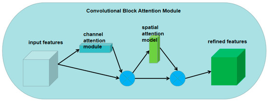 The channel attention module (CAM) and spatial attention module (SAM) make up the convolutional block attention module (CBAM). While the SAM enables the network to concentrate on the locations that are rich in context information in the whole image, the CAM lets the network focus on the foreground of the image and the significant region. These two modules can be used together. The CBAM begins with the channel and spatial range. To realize the sequential attention structure from channel to space, two analytical dimensions (spatial attention and channel attention) are added [22]. Instead of disregarding the irrelevant region, the neural network may be trained to pay greater attention to the pixel region in the image that defines focus segmentation using a spatial attention module (SAM). The channel attention module (CAM) is used to handle the allocation relationship of the feature mapping channels. At the same time, allocating attention to two dimensions enhances the improvement in the attention mechanism and its effect on model performance. The structure of the CBAM is shown in Figure 2.