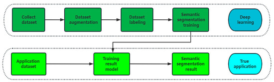 The training portion and the application portion of the segmentation stages for the standing trees are shown in Figure 4. In order to create a collection of training data for standing tree images, the camera’s upright tree image was first utilized, increased by data augmentation, and then labeled. The semantic division network was then fed the learned dataset. The segmentation model was created after training, and the training ended when the loss value approached convergence. In a practical application, the training model was fed an image of the target standing tree to produce the segmentation effect.