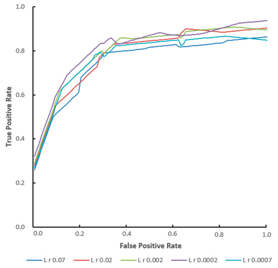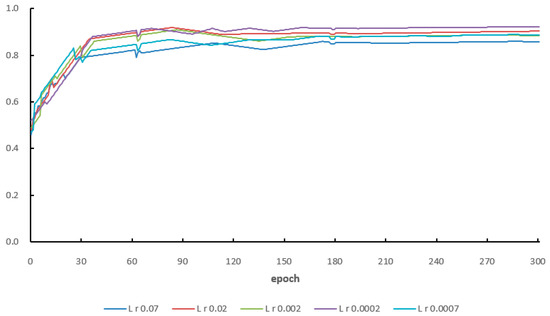 For the experimental environment, refer to 3.1. In order to improve the accuracy of the model, the weighted loss function was used as the loss function for the segmentation model, and a new attention module was also introduced to improve the segmentation accuracy of the model with opposite trees. We input the training dataset with labeling information into the improved Yolo v7 mask network for training. For the dataset, 70% of the images were randomly selected for the training set, 20% of the images for the verification set, and 10% of the images for the testing set. Because too low or too high a learning rate will lead to slow or even no convergence of the model, it was necessary to determine the appropriate initial learning rate [33]. In this paper, the accuracy of the five models designed and tested under the initial learning rate in the training was evaluated, and eight classified data were combined. The results are shown in Figure 5 and Figure 6. It can be seen that the model had the highest accuracy when the learning rate was 0.0002, and the epoch was 200. See Table 2 for the training hyperparameters of the Yolo v7 model.