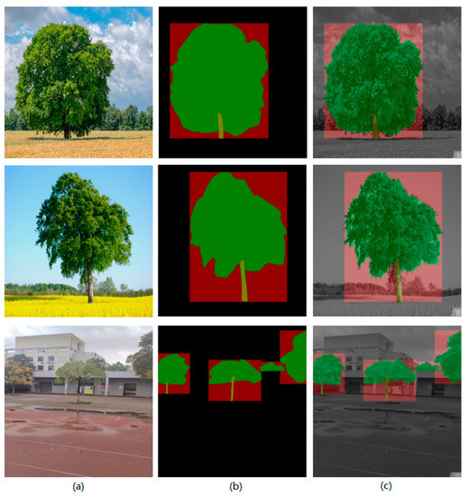 An open-source program called LabelMe 1.5.1 was used to annotate the images in the datasets. The Massachusetts Institute of Technology’s (MIT) Computer Science and Artificial Intelligence Laboratory (CSAIL) created the image labeling program labelme. This program can be used to perform image tagging or to construct custom labels. The project’s source code is available for download [30]. Labelme is a program for graphically marking images that can mark points, line segments, rectangles, polygons, and other shapes. Annotation data are saved in the json format. However, Yolo does not support json files; thus, json code must be used to convert the data of the text. In the figures, the backdrop is black and the segmentation of the standing tree is in red.