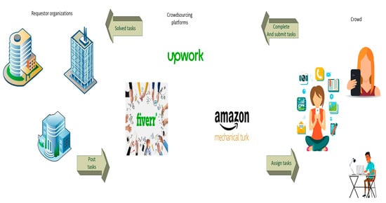 Crowdsourcing is a popular strategy for accomplishing a variety of tasks. Several individuals and their interactions are involved in the process, such as requesters and crowdsourcers [] that manage, execute, and supervise crowdsourcing initiatives and may post task requests, the crowd (individuals) [], consisting of virtual employees who participate in outsourcing activities or events, and the platform [], which serves as a channel for interaction between the crowd and the crowdsourcers. The people on these platforms are connected by means of social media such as Facebook, WhatsApp, Instagram, Twitter, Y-mail, and Gmail accounts. Social networking improvements have encouraged corporations to collect information from individuals all over the world in order to identify the best solutions to unique challenges [,]. Crowdsourcing allows enterprises to hire globalized, low-cost, and talented workers through internet platforms [,].Crowdsourcing is employed for a wide range of tasks including spelling correction, content creation, coding, pattern recognition, software development, and debugging []. The task is advertised on a platform, and the crowd participates in various types of activities []. Considering the user interface and their intrinsic motivation, crowdsourcing platforms utilize appealing concepts that promote human–computer interaction in the context of open innovation []. In some situations, computers may be used to manage crowdsourced tasks, resulting in human-based computation systems. This type of human-based computing is incorporated in many online systems (crowdsourcing platforms) []. Crowdsourcing platforms are websites that work as the interface between job seekers and online people. Both entities are registered on these crowdsourcing platforms. The platform uses various selection methods such as skill testing, profiling, previous participating history, matching, and many others to select an appropriate participant to accomplish requestor tasks [].