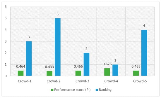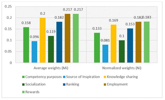 Figure 2 indicates the overall weights of the criteria (participation reasons). Here, rewards and employment are the primary motives of crowds for task accomplishment, followed by knowledge-sharing, ranking, competency purpose, socialization, and source of inspiration.