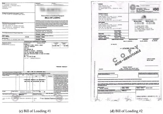 This study used business document images collected via our currently deployed active products between 1 March and 31 August 2022. The documents were received as images from the scanner, and the text that appeared in the document was extracted using the NAVER CLOVA OCR engine [34,35]. For labeling of the KIE task, the entities were labeled to extract in each document similar to CORD [36] and FUNSD [37], and this was worked by two people and inspected by one person. Most financial documents require various document images, such as semi-structured or unstructured. The dataset must contain key-value pairs for humans to extract data from banks manually. Therefore, we used two datasets for KIE: (1) Business Registration Certificate (BRC) and (2) Bill of Loading (BL). These financial data contain sufficient key-value pairs and satisfy the dataset mentioned above conditions.