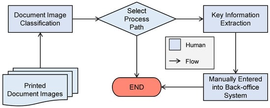 With the advances in AI, the digitization that moves data from analog to digital has been studied in various fields, such as insurance, banking, healthcare, and manufacturing [14,17,18,19]. In particular, various attempts using deep learning or machine learning have been made for digitization. In most of these attempts, classification mechanisms or NLP have been employed for digitization. For instance, Baidya [17] proposed an automated business process with a support vector machine classifier and an RPA to classify unstructured documents. Roopesh et al. [18] proposed an intelligent system for automating interview processes using RPA and AI to help recruitment. The system first monitors mail and attachment using RPA, then uses two deep learning models to classify resumes and extract essential information. Deep learning models take embedded text information extracted by OCR as input, classify it using bidirectional long short-term memory (LSTM) and extract essential information using NER based on the LSTM-CRF model. Guha et al. [19] proposed a multimodal binary classification approach based on state-of-the-art transfer learning techniques involving images and NLP models to classify insurance documents. Image and textual features were extracted simultaneously from the document image using VGG-16 and the pre-trained Bidirectional Encoder Representations from Transformer (BERT) model, respectively, through fine-tuning. Mungmeeprued et al. [20] proposed a deep learning solution to determine whether a page is a breaking point given a sequence of visually rich document images as input. This solution combines LayoutLM and residual network (ResNet) [21] to exploit the document pages’ textual and visual features and achieve state-of-the-art (SOTA) in the task.