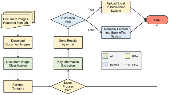 In this step, we explain the overall flow chart of a framework that combines AI with an automated click bot called RPA. Our proposal consists of three components: (i) RPA, (ii) AI, and (iii) humans. Figure 2 and Figure 3 show that several manual works were changed to automation using AI and RPA. The framework first starts by loading the printed document by the user into the database through the scanner, and then the RPA downloads them as image files. A multimodal approach replaces manual document image classification. This is not only cost-effective compared with the actual business process, but it is possible to classify documents more accurately. We use fine-tuned LayoutXLM that can be classified for each document type as the multimodal approach.