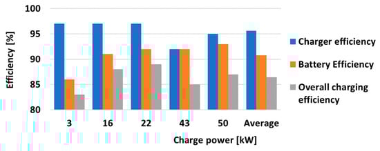 Charger efficiency, battery efficiency, and overall charging efficiency by the power of the charging system (with average values).
