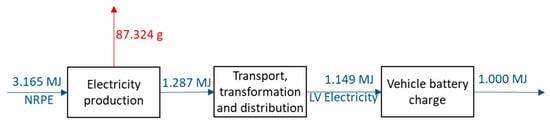 As reported in [11], Figure 2 shows the energy conversion of electricity, the conversion of 3.165 MJ as input (kinetic, potential, or chemical) to electric energy results in 1.287 MJ. Then, after the transport, transformation, and distribution, it remains at 1.149 MJ, and the energy stored in the vehicle battery is 1.000 MJ.