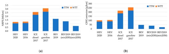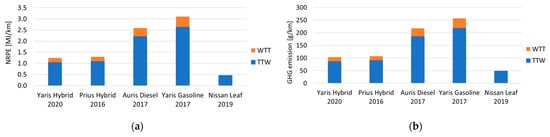 Figure 4 reports the whole WTW analysis by summing both contributions of WTT and TTW emissions. It includes two graphs: the specific consumption of NRPE (a) and the GHG emissions (b).