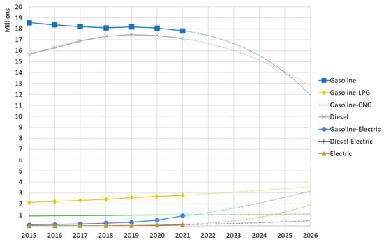 Table 5 reports the circulating Italian car fleet from 2015 to 2021, divided by fuel (methane-powered vehicles and gasoline–methane are counted in the same category). Assumptions in the event of more drastic political choices may considerably differ from these projections. Figure 5 shows the vehicle trends; each curve fits with a polynomial function (Equation (2)).