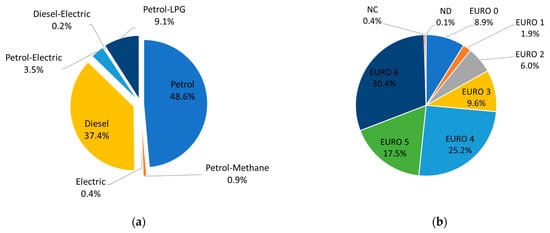 Figure 6 shows the principal distributions with percentage values divided by fuel (a) and the EURO standard (b). The source provides for each category the vehicle size as requested by the COPERT model (small, medium, and large).