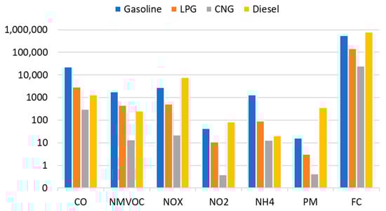 Figure 7 shows emissions evaluation in tons with a logarithmic scale for the circulating car fleet in Rome province (2.7 Mln vehicles) in 2021. The main fuel types are gasoline, LPG, CNG (methane), and diesel. The figure shows the impact of fuel on pollutants and fuel consumption (FC or NPRE). The emissions are calculated by multiplying the car fleet in Table 10 by the average annual distance as in Table 8 and by the relative EFs in Table 3.