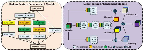 To enhance the model feature extraction ability and relationships between different features, inspired by Inception [], ResNet [], and dual-path network (DPN) [], we proposed shallow feature enhancement (SFE) module and deep feature enhancement (DFE) module. The structure of the feature enhancement module is shown in Figure 2.