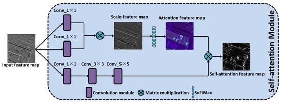 In the operation process of CNN, since the limited and fixed size of the convolution kernel, each convolution operation can only cover the area calculated by the convolution kernel, so the global feature and multi-scale feature contained in the image are not easily obtained. To make the features extracted by the convolution layer more relevant, the self-attention mechanism (SAM) is introduced in FESSD, and the structure of self-attention is shown in Figure 3. The SAM is mainly used to perform multi-scale transformation and fusion of input feature maps. The SAM module includes convolution, feature transformation, feature scaling, and feature fusion. The convolution operation can normalize the channel of the input feature map; the feature transformation and scaling are used to enhance the correlation between different feature points in the feature map; and the feature fusion output the final self-attention feature map.