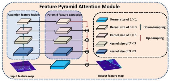 As shown in Figure 4, FPAM includes pyramid feature extraction (PFE) module and attention feature fusion (AFF) module, where the PFE module is used to obtain multi-scale features of different feature map; AFF module is used for multi-scale fusion of different scale attention feature maps. Specially, the PFE module includes four layers of convolution structure, in which , , , and convolution operation are used for multi-scale feature extraction, and the down-sampling is used to reduce the feature map resolution size; the AFF module is constructed with a hierarchical manner, the multi-scale feature extraction is performed by using different size convolution kernels, and the up-sampling operation is used to generate the attention weight map. Moreover, to avoid the misjudgment of the original input feature map in the process of PFE and AFF module, the original feature map is linearly superimposed with the result of AFF module. The FPAM can mapping the feature into different sub-regions, it by aggregating the semantic content of different sub-regions to make the final output feature have global semantic information.