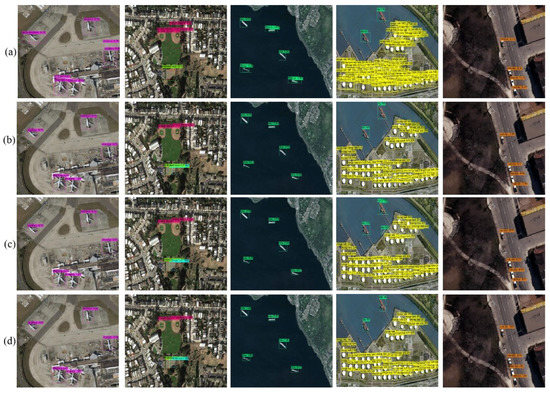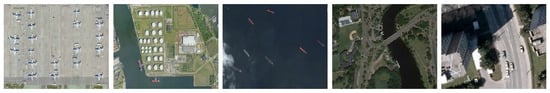 The dataset is named SD-RSI, and the original image and annotation is available at https://drive.google.com/drive/rs-drive (accessed on 5 December 2022). The specific target categories include airplane, ship, bridge, vehicle, storage tank (ST), baseball diamond (BD), and tennis court (TC), which contain 10,550 instance samples, 7558 targets are used as the train dataset, and 2992 targets are used as test dataset. The train samples are separately rotated with the angle of , which extend the number of train samples by 40 times. In addition, according to the criterion, the collected optical remote sensing images are divided into four classes (i.e. small target: area < m; medium target: m < area < m; Large target: area > m) for split the target size, the target data distribution is shown in Table 1. Compared with the existing dataset NWPU VHR-10 [] and AID [] dataset, the constructed dataset mainly focuses on small size and medium size targets, and the target distribution is denser.