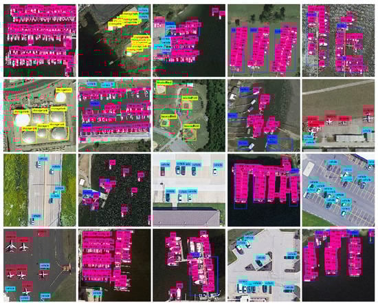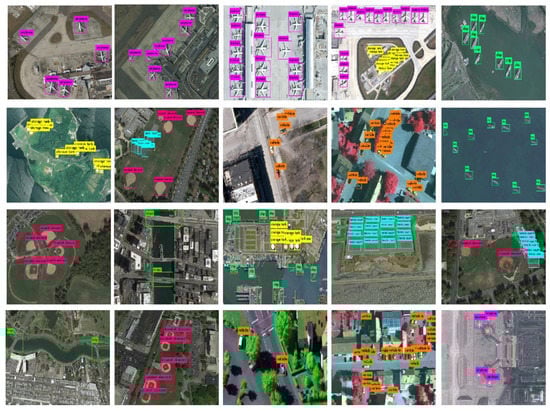 To further verify the performance of FESSD, we conducted experimental analysis on the DIOR dataset. The DIOR dataset contains more than 23 k images and 192 k instances, covering 20 object categories []. In the experimental process, we selected small and dense target categories such as airplane, harbor, ship, vehicle, baseball field (BF), and storage tank (ST) as detection objects, and the performance quantitative analysis of different methods is shown in Table 4. It can be seen from Table 4 that the mAP of FESSD on the DIOR dataset reaches 0.812, which is higher than other compared methods. The mAP of ML-based methods CBS-Model and PIIF are 0.659 and 0.620, indicating that these methods cannot accurately detect small and dense targets. DL-Based remote sensing target detection methods ASBL-RetinaNet, RECNN, and GLS-Net achieve better detection results, but the detection accuracy is relatively poor for small targets such as airplane, ship, and vehicle. The mAP of generic target detection methods SSD, YOLOV3, and FFESSD are 0.669, 0.693, and 0.755, although better than the ML-based methods, but cannot satisfy the requirements for accurate detection of remote sensing targets. In term of detection speed, the FPS of FESSD reaches 36.5, indicating that it can achieve fast detection of remote sensing targets. Figure 8 shows the visual detection results of FESSD on the DIOR dataset, from which it can be seen that FESSD can achieve accurate detection and location of different remote sensing target categories.