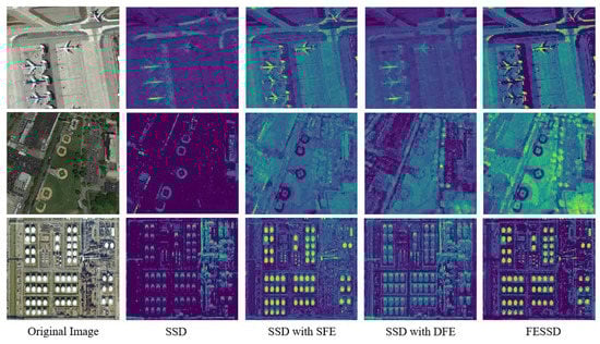 To compare the feature enhancement effects of different feature enhancement modules on the network, we visualize the last convolution layer of FESSD, and the results are shown in Figure 10. It can be seen from the Figure 10 that the original SSD algorithm has no obvious effect on the feature extraction of the detected target, and a large amount of target feature information is lost; When the SFE module is introduced, the feature extraction ability for target has been significantly enhanced, especially for the contour and texture features of small targets; When the DFE module is introduced, its feature extraction ability has been greatly improved compared to SSD, but the feature enhancement effect is not very obvious, because the function of DEF module is to deepen the depth of the network and alleviate the overfitting problem during the training process; FESSD has significant target area feature enhancement capabilities, it can be seen that FESSD accurately enhances the target area features and suppresses a large amount of background information.