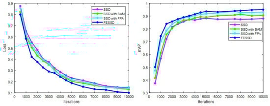 The influence of different attention mechanisms on the model training process and detection accuracy is shown in Figure 11. After iterative training, the loss value of SSD algorithm is 0.145, and the detection accuracy mAP reaches 0.832, indicating that its training effect and detection performance still need to be improved. When the attention mechanism module is introduced, both the SAM module and the FPA module improve the performance of the SSD algorithm. When the SAM module is introduced, the loss value and mAP of the model reaches 0.130 and 0.905. When the FPA module is introduced, the loss value and mAP of the model reaches 0.140 and 0.931. Compared with the SSD algorithm, the model with FPA and SAM has obvious advantages, and from the loss curve and mAP value, it can be analyzed that the FESSD model training effect and detection performance are better.