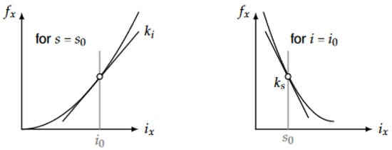 Figure 3. Linearised force-current factor k i and force-displacement factor k s ; adopted from [1].