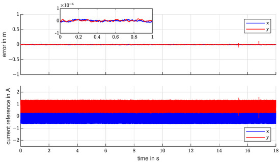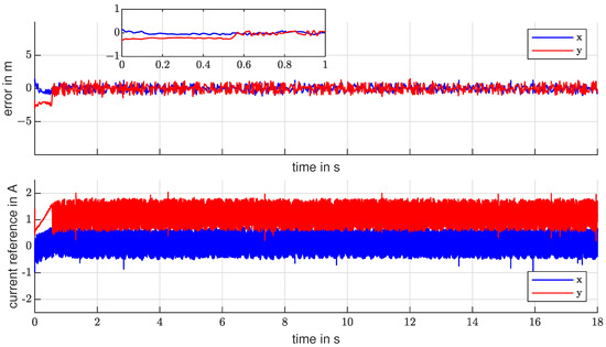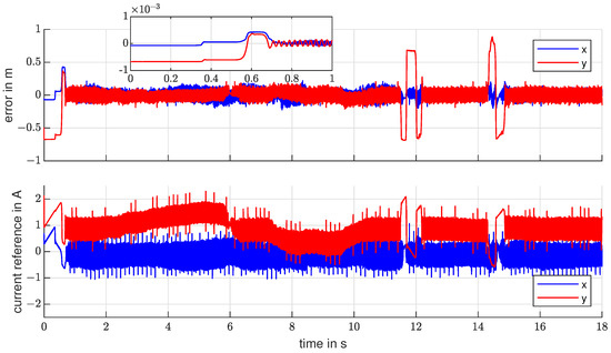 To not leave behind the potential performance benefits, the aim is to integrate the dynamics of the current controller into the position controller model. This forms a cascading control loop consisting of a current controller with predefined behaviour, according to an industrial criterion and a position controller, that is aware of the current controller’s dynamics. A further potential benefit of the explicit current controller is the smoothing of the current reference from the sliding mode controller. Since sliding mode is known for its high-frequency switching nature, it seems beneficial to have a predefined bandwidth for the current dynamics. Especially since this control pattern will be used in further research regarding bandwidth-limited sensorless techniques. Table A1 and Table A2 provide a list of the used symbols and indices.