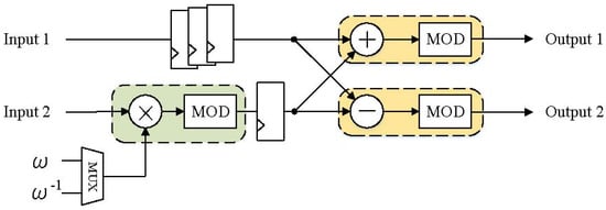 Butterfly calculation is a key step for NTT algorithm to accelerate polynomial multiplication, and it is also the core operator of NTT algorithm. The butterfly calculation of the NTT algorithm is divided into Cooley–Tukey butterfly calculation based on time extraction and Gentleman–Sande butterfly calculation based on frequency extraction. The internal operation order of the two butterfly calculations is different, but the amount of calculation is the same; that is, a butterfly calculation is completed. The shape calculation requires performing one modular multiplication and two modular additions and subtractions. In this paper, DIT-NTT based on Cooley–Tukey butterfly computing is used as the basic algorithm of hardware design. The hardware block diagram of the butterfly computing unit is as follows. Figure 4 represents the hardware architecture of the butterfly unit.