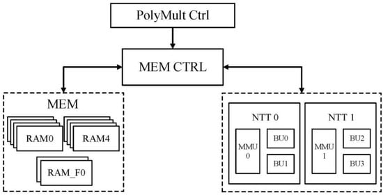 It can be seen that the hardware architecture of the polynomial multiplier proposed in this paper contains two parallel NTT/INTT modules, and each NTT/INTT module contains an independent modular multiplication unit. Only one INTT operation needs to be performed in a polynomial multiplication operation. Therefore, when the INTT operation stage is reached, one NTT module is in an idle state. At this time, the idle modular multiplication unit can be called. The multiplication unit satisfies exactly two calculations in Equation 4. Before postprocessing, read the twiddle factor from RAM, input the two modulo multiplication units to multiply by, and then multiply the two calculation results with the corresponding terms of the result polynomial coefficients. Similarly, the prestored parameters required for the reverse INTT operation process and postprocessing process are N/2 = 256 twiddle factors, occupying approximately 0.5 KB of memory.