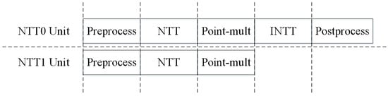 Figure 8 shows the operation flow of the polynomial multiplier. It can be seen that NTT0 and NTT1 unit in multiplier can execute preprocessing, NTT and pointwise multiplication operation in parallel, and INTT operation and postprocessing are operated by NTT0 alone.