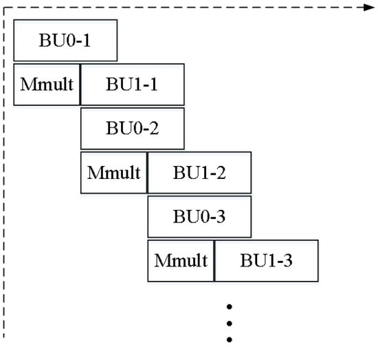 Figure 9 shows the pre/postprocessing operation flow of NTT module. BU0-1 means the first calculation performed by butterfly unit 0 in the H-NTT unit, and Mmult means the modular multiplication operation performed by Modmult unit in the H-NTT unit. It can be seen that in the NTT unit, BU0, and BU1 can be calculated in parallel, whereas BU1 needs to calculate the corresponding scaling factor and through modular multiplication unit before calculation. In addition, it can also be seen that in a butterfly unit, the computing task is pipelined.