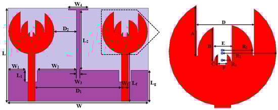 The design of the novel compact two-element MIMO antenna is depicted in Figure 1. The proposed antenna of size 24 × 36 mm2 (L × W) comprises fractal loaded circular shaped radiators and a partial ground plan with T-shaped stub. The proposed antenna is fed by 50-ohm microstrip line feed with dimensions Lf × Wf. The desired bands sub-6GHz 5G and WLAN band (5.15–5.85 GHz) are obtained by fractal loading and slots on ground plan near the feed line. The dimensions of the proposed two-element MIMO antenna are listed in Table 1. The simulated S-parameters of the proposed antenna are shown in Figure 2. It can be observed from Figure 2 that the antenna is operating at sub 6 GHz and WLAN bands with good impedance matching characteristics (S11 ≈ 62 dB) and high isolation (or low mutual coupling) greater than 15 dB.