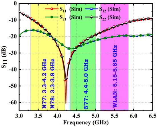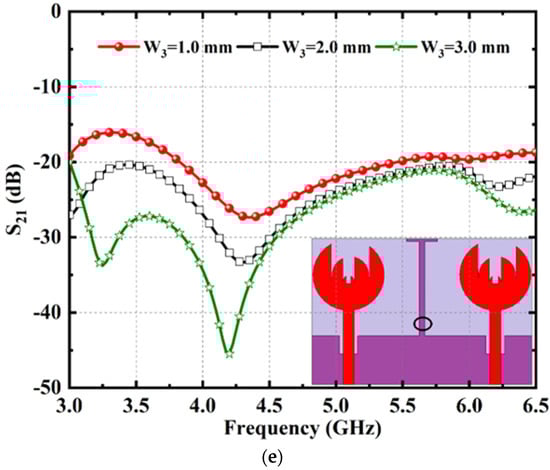 Figure 4d represents the effect of T-shaped stub width W3 on the S11 and S21 (isolation parameter). It can be observed that the impedance matching (S11) is improved from −25 dB to 62 dB, but port isolation (S21) is decreased from 27 dB to 15 dB as the stub width W3 decreases from 3 to 1 mm. W3 = 3 mm offers high isolation, but poor impedance matching (S11 = −25 dB). However, W3 = 1 mm provides good impedance matching with acceptable port isolation and hence is selected in this design.