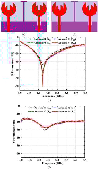 The evolution of the two-element antenna is illustrated in Figure 3a–d. Antenna#1 is designed by two circular-shaped radiating elements of radius R1 mm each and a partial ground of size Lg × W mm2. Two slots are etched on the ground plane to achieve impedance matching in the working band. Then, a T-shaped stub (L2 × W3 and W3 × W4) is protruded to improve the isolation above 15 dB between the antenna ports. It is evident from Figure 3e that all antennas are resonating at 4.25 GHz with a frequency range of (3.3–6.0) GHz and S21 of more than 15 dB, but they differ in S11 values. Later, a rectangular slot of size A × D mm2 is etched from each circular patch element of Antenna#1 to form Antenna#2 as given in Figure 3b. As a result, S11 is improved from −35 dB to −42 dB. Antenna#3 is constructed by adding R2 mm radius circle with rectangular slot cut (B × E mm2) to the Antenna#2. The S11 is increased from −42 dB to −45 dB due to the inclusion of rectangular slotted circle. Finally, the proposed antenna denoted by Antenna#4 is formed by loading circle of radius R3 mm with rectangular slot of C × F mm2 to the Antenna#3 which results in further improvement in S11 from −45 dB to −62 dB. It is observed that Antenna#4 (proposed antenna) offers good impedance matching characteristics (S11 = −62 dB) and hence is adopted in this work. The S21 responses of all the evolution stages are depicted in Figure 4f.