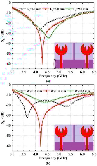 The parametric analysis is conducted on two-element MIMO antenna design parameters (such as Lg, Wf, L1, and W3) to better understand its behavior in terms of impedance matching (S11) and isolation (S21) characteristics, as depicted in Figure 4. It is noticed from Figure 4a that the lower cutoff frequency is around 3.3 to 3.4 GHz and higher cutoff frequency is about 6 GHz for all values of ground plane length Lg. However, when compared with Lg = 7 mm and 9 mm, Lg = 8 mm provides better S11 values and hence is selected as ground plane length in the proposed design. The effect of the feed width (Wf) on the impedance matching characteristics is presented in Figure 4b. It is found that as Wf changes from 1.3 to 2.3 mm, the lower cutoff frequency is shifting to right and upper cutoff frequency shifts to the left. Additionally, the S11 value for Wf = 1.3 mm and Wf = 2.3 mm is relatively less when compared with Wf = 1.8 mm. The required frequency band from 3.3 to 6.0 GHz with good S11 value is obtained for feed width Wf = 1.8 mm and hence selected in this proposed design. To improve the impedance characteristics (S11), two slots are etched from the ground plane under the feed line. The slot width denoted by L1 plays a crucial role in improving S11 as given in Figure 4c. It is identified that as L1 changes from 2 to 4 mm, the S11 parameter also changes. The required band from 3.3 to 6.0 GHz with good S11 value is achieved for slot width L1 of 3 mm and therefore chosen in this design.
