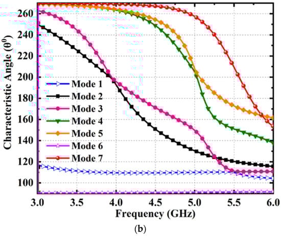 The results of the proposed two-element MIMO antenna are verified by performing theory of characteristic mode (TCM) analysis which is discussed in [31,32]. The parameters such as modal significance (MS) and characteristic angle are analyzed as a function of frequency. From the modal significance (MS) plot, a mode is said to be resonant mode when its modal significance value is in between 0.7 and 1.0. The modal significance (MS) as a function of frequency is depicted in Figure 5a. It can be found that modes such as Mode 2–5 and Mode 7 are the resonant modes since their value MS value is more than 0.7 and Mode 1 and Mode 6 are the non-resonant modes below 6 GHz. The characteristic angle vs. frequency plot is depicted in Figure 5b. A mode is said to be resonant mode when its value is around 180° as per the characteristic angle vs. frequency plot. It can be identified from Figure 5b that the Mode 2–5 and Mode 7 are the resonant modes as their values are around 180° and Mode 1 and Mode 6 are the non-resonant modes because their values are below 180°. The TCM analysis results agree well with the already proposed results. The equations of modal matrix, modal significance, and characteristic angle are represented in Equations (1)–(3) [33,34].
