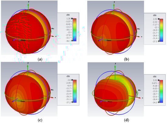 The 3-D polar radiation characteristics of the two-element MIMO antenna at 3.5 GHz, 4 GHz, 4.5 GHz, and 5.5 GHz are presented in Figure 6. The proposed antenna offers steady boresight radiation patterns in the z-direction at all abovementioned frequencies, which makes it ideal for WLAN and 5 G sub-6 GHz applications.