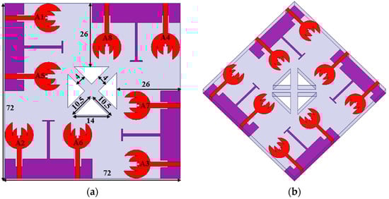 The design of eight-element MIMO antenna of size 72 × 72 mm2 is depicted in Figure 7. The basic reason for extending two-element to eight-element is to enhance the capacity and data rate of the wireless devices. In the proposed design, all the two-element antennas are orthogonally spaced to enhance the isolation between the antenna ports. Furthermore, four triangle-shaped slots are etched at the center of the dielectric substrate to enhance the isolation above 15 dB. The impedance matching and isolation curves of the eight-element antenna are illustrated in Figure 8.