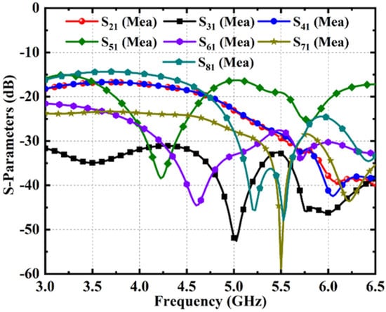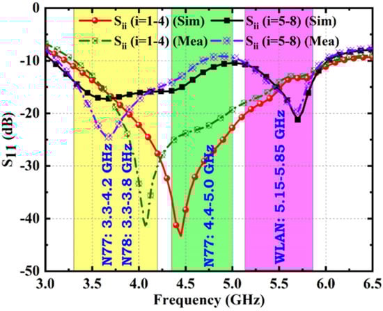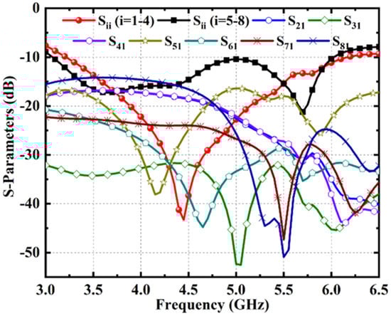 The comparison of simulated and measured S-parameters (Sii, where i = 1 to 8) are plotted in Figure 10. It is identified from Figure 10 that the antenna operates from 3.3 GHz to 6 GHz covering four bands such as N77 (3.3–4.2 GHz), N78 (3.3–3.8 GHz), N79 (4.4–5.0 GHz), and WLAN (5.15–5.85 GHz) with good impedance matching properties. The simulated and measured findings are in good agreement; however, there is a small difference because of conducting, dielectric, and SMA connection losses as well as fabrication tolerances. Figure 11 illustrates the measured isolation parameters of the proposed antenna. The proposed antenna offers enhanced isolation of greater than 15 dB between the antenna ports. Figure 8 and Figure 11 show that, with a few minor exceptions, there is a good match between the values for simulated and measured isolation. Figure 12 depicts the fabricated prototype of eight-element MIMO antenna.
