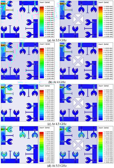 The isolation parameter is also analyzed at resonant frequencies such as 3.5 GHz, 4 GHz, 4.5 GHz, and 5.5 GHz by using the surface current distribution when port-1 is excited, whereas other ports are terminated by 50-ohms load, as presented in Figure 9. As observed in Figure 9, without decoupling structure, the surface current of one element is entered into adjacent elements which degrade the radiation performance of the antenna. However, with T-shaped stubs and triangle-shaped slots, the surface currents are blocked and thus improve the isolation between the ports.