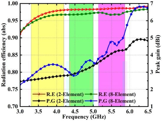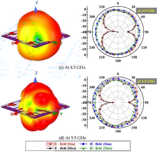 One of the most crucial characteristics of any antenna is its radiation performance. It specifies the nature of the fields, their strength, and the direction in which they are emitted. Figure 13 represents the two and eight-element MIMO antenna radiation efficiency and peak gain response curves. The proposed design achieves more than 95% radiation efficiency and greater than 2.5 dBi in the entire working band from 3.3–6.0 GHz. The simulated and measured E- and H-field radiation patterns at 3.5 GHz, 4 GHz, 4.5 GHz, and 5.5 GHz working bands of the proposed element MIMO antenna are depicted in Figure 14. It is noticed that E-fields are bi-directional and H-fields are omnidirectional patterns. Additionally, it can be found from 3-D polar patterns that the antenna has steady boresight radiation patterns at resonant bands that make it ideal for WLAN and 5G sub-6 GHz communication.