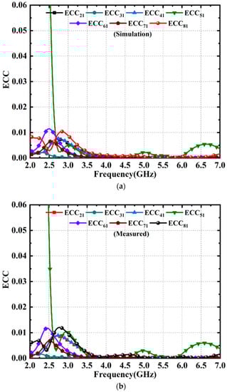 The envelop correlation coefficient (ECC) is a parameter used to analyze the MIMO antenna diversity [15]. Equations (4) and (5) for an N- and two-element system represent the ECC, which specifies how the channels are correlated. ECC if 0 means no correlation and 1 means very high correlation between the signals. ECC of less than 0.5 is the allowable value of ECC in practical applications. Figure 15a,b describes the simulated and measured ECC curves of the proposed eight-element MIMO antenna. It can be found that the proposed structure offers <0.005 throughout the band.