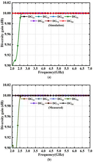 The diversity gain (DG) is a measure of the performance level of antenna diversity approaches [15,35]. Equation (6) can be used to evaluate the proposed MIMO antenna diversity performance. Figure 16 depicts the simulated and measured DG plots as a function of frequency where DG of approx. 10 dB is achieved across the working band.