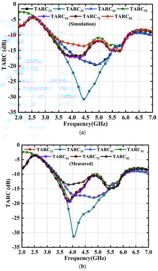 Individual antenna S-parameter values are insufficient to analyze MIMO system performance when two or more antennas are placed next to each other. When both antenna elements are activated simultaneously, the radiation impacts the other antenna. Individual self-impedance and mutual impedance will vary. The S-parameters of individual MIMO antennas will not provide a perfect analysis. Total active reflection coefficient (TARC) is used to assess MIMO system behavior. TARC considers self and mutual impedance changes [36,37]. The following equation calculates the TARC for a two-port MIMO system (7). The proposed structure has TARC values below −10 dB across the spectrum Figure 17a,b.