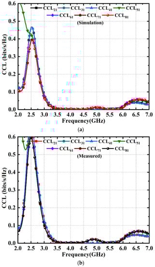 The channel capacity loss (CCL) defines how many bits are lost when two or more channels transmit signals at the same time. The mutual coupling between antenna elements is one of the main causes of capacity loss. Equations (8)–(10) are used to find the CCL in terms of S-parameters. The simulated and measured CCL plots are given in Figure 18. The proposed design delivers the CCL of <0.02 in the entire band.