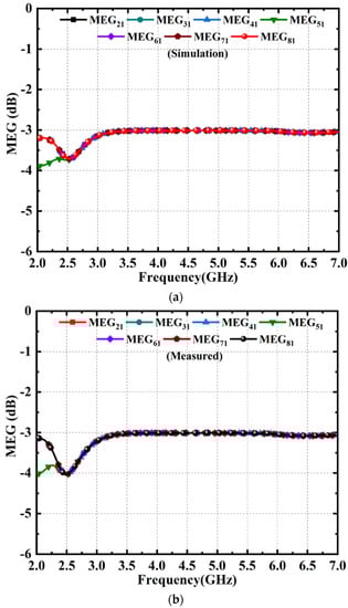 The mean effective gain (MEG) is a diversity performance indicating parameter that describes an antenna’s ability to receive electromagnetic signals in a multipath environment [38]. Equation (11) is used to calculate the MEG of the proposed antenna. Figure 19a,b illustrates the simulate and measured MEG plots, respectively. It is seen that the MEG of −3 dB is obtained in complete band from 3.3 to 6.0 GHz.
