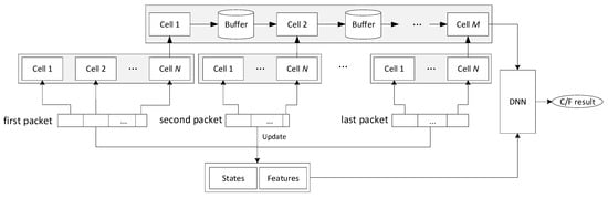 In a typical deep learning model with fixed input shapes, it is not possible to perform a gradual classification of the sessions to which the received packets belong each time they are received [,]. However, deep learning models, such as recurrent neural network (RNN), gated recurrent unit (GRU), and long short-term memory (LSTM), address these constraints by generating cycles between nodes [,,,]. Thus, the deep learning model of the proposed NIDS performs classification with the LSTM classifier for every packet received, stores the results, and uses this result and newly received packets as LSTM inputs to progressively continue the classification for the session. Therefore, the required storage space can be significantly reduced because the packet data itself need not be stored and only the output result of the corresponding cell of the LSTM needs to be stored. Figure 2 shows a block diagram of the LSTM used in the proposed scheme for the incremental classification of sessions. When the proposed NIDS receives the first packet (i.e., Packet 1) of the session, it inputs packet 1 to the first cell (i.e., Cell 1) of the LSTM classifier. Afterwards, the hidden states and cell states of cell 1 are temporarily stored in the buffer until the next packet of the session (i.e., Packet 2) is received. When NIDS receives Packet 2, it inputs the values stored in the buffer and Packet 2 into Cell 2 to proceed with the next classification process, and the hidden states and cell states of Cell 2 are stored in the buffer again. In this way, classification of one session is gradually progressed, and the output value of the last cell (i.e., Packet N) is used as a feature to classify the session.